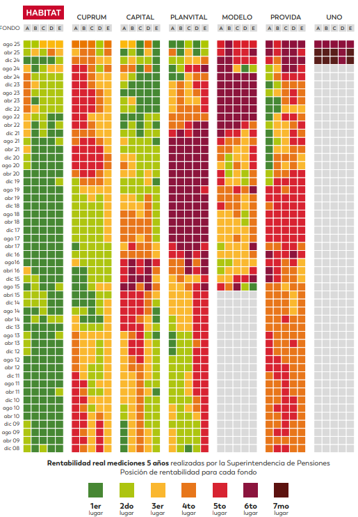 Rentabilidad de la cuota expresada en forma real promedio anual de Habitat: Fondo A (Más riesgoso) 3,90%; Fondo B (Riesgoso) 3,10%; Fondo C (Intermedio) 0,96%; Fondo D (Conservador) -0,46%; Fondo E (Más conservador) -0,47% .