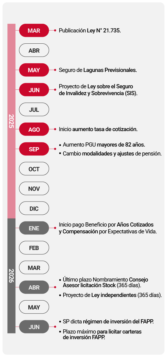El pasado 26 de marzo se publicó la reforma al Sistema de Pensiones (Ley N°21.735). Su implementación será gradual, y debe complementarse con diversos reglamentos y circulares que deben publicar los Ministerios de Hacienda, Trabajo y Previsión Social y la Superintendencia de Pensiones (SP).